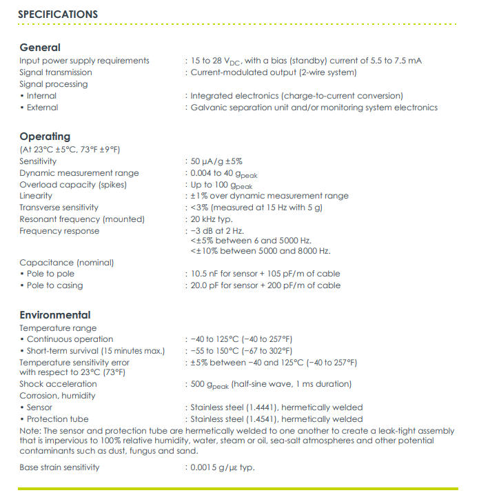 Description The CE311 piezoelectric accelerometer from Meggitt’s vibro-meter® product line is a vibration sensor designed for the monitoring and protection of machinery in harsh industrial environments and/or hazardous areas. The CE311 sensor features a symmetrical shearmode measuring element using polycrystalline material. The sensor uses integrated electronics to provide the required signal processing, eliminating the need for an external signal conditioner (charge amplifier). The electronics also performs charge-to-current conversion in order to provide a current-modulated output signal that is suitable for transmission over long distances. The CE311 is fitted with an integral cable (twisted pair, shielded) in a hermetically sealed link, protected by a flexible, leak-tight protection tube (stainless-steel hose). More specifically, the sensor and protection tube are hermetically welded to one another, resulting in a system that is fully protected against cooling fluids, lubricants, water, steam and other potential contaminants. This makes the CE311 an extremely reliable device suitable for the long-term monitoring of vibration in many industrial applications. The CE311 sensor and electronics are insulated from their housings (integral case insulation) and have a sensitivity of 50 µA/g. The CE311 is available in different versions with various cable lengths for different industrial environments: standard versions for use in standard (non-hazardous) areas and Ex versions for installation in hazardous areas. The CE281 piezoelectric accelerometer from Meggitt’s vibro-meter® product line is a vibration sensor designed for the monitoring and protection of machinery in harsh industrial environments and/or hazardous areas. The CE281 sensor features a centre-mounted symmetrical shear-mode measuring element using polycrystalline material. The sensor uses integrally attached electronics to provide the required signal processing, eliminating the need for an external signal conditioner (charge amplifier). The attached electronics also performs charge-to-current conversion in order to provide a current-modulated output signal that is suitable for transmission over long distances. The sensor head is connected to the attached electronics by an integral cable (low-noise, shielded) in a hermetically sealed link, protected by a flexible, leak-tight protection tube (stainlesssteel hose). More specifically, the sensor head, protection tube and electronics housing are hermetically welded to one another, resulting in a system that is fully protected against cooling fluids, lubricants, water, steam and other potential contaminants. The CE281 sensor and electronics are insulated from their housings (integral case insulation) and have a sensitivity of 10 µA/g. The CE281 is available in different versions for different industrial environments: standard versions for use in standard (non-hazardous) areas and Ex versions for installation in hazardous areas. The CE281 piezoelectric accelerometer is an extremely reliable device that is suitable for the long-term monitoring of vibration in many industrial applications. KEY FEATURES AND BENEFITS CE311 : • From the vibro-meter® product line • Sensitivity: 50 µA/g • Frequency response: 2 to 8000 Hz • Temperature range: −40 to 125°C • Long-distance signal transmission • Integrated electronics • Integral case insulation • Available in standard versions and Ex versions certified for use in potentially explosive atmospheres CE281 : • From the vibro-meter® product line • Sensitivity: 10 µA/g • Frequency response: 3 to 7000 Hz • Temperature range: −55 to 260°C (sensor) and −40 to 125°C (electronics) • Long-distance signal transmission • Integrally attached electronics • Integral case insulation • Available in standard versions and Ex versions certified for use in potentially explosive atmospheres APPLICATIONS Vibration monitoring in harsh industrial environments and/or hazardous areas Vibration monitoring in harsh industrial environments and/or hazardous areas